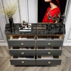 47″ Modern Green Dresser Faux Marble Top Cabinet With 6 Drawers In Gold